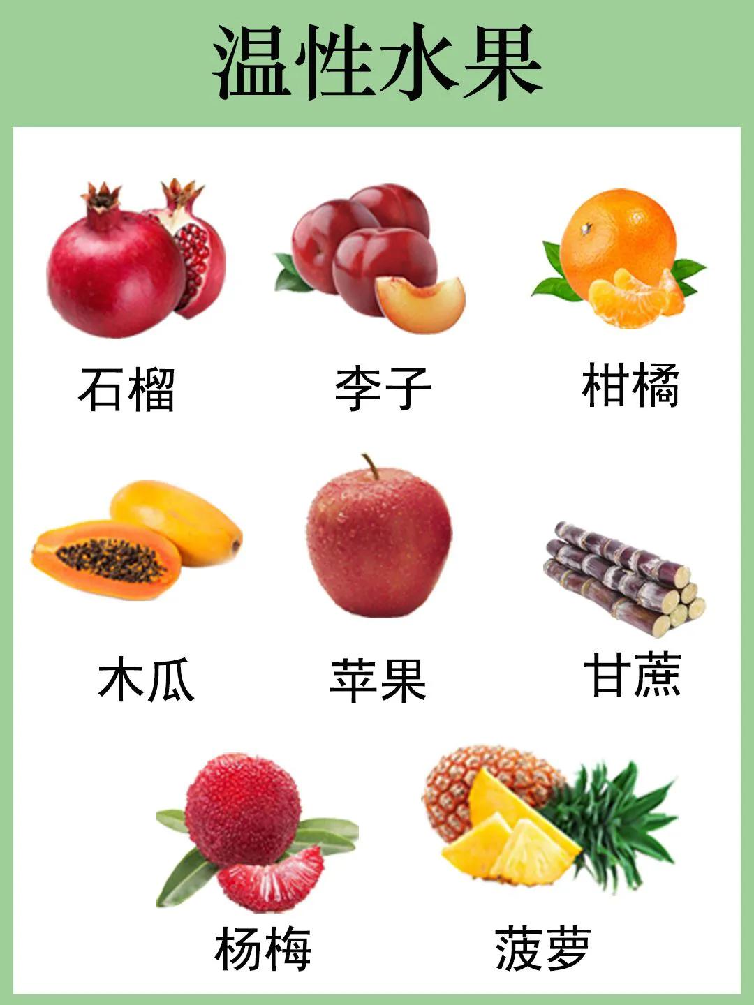 常见的温性水果有:石榴、李子、柑橘、木瓜、苹果、甘蔗、杨梅、菠萝。