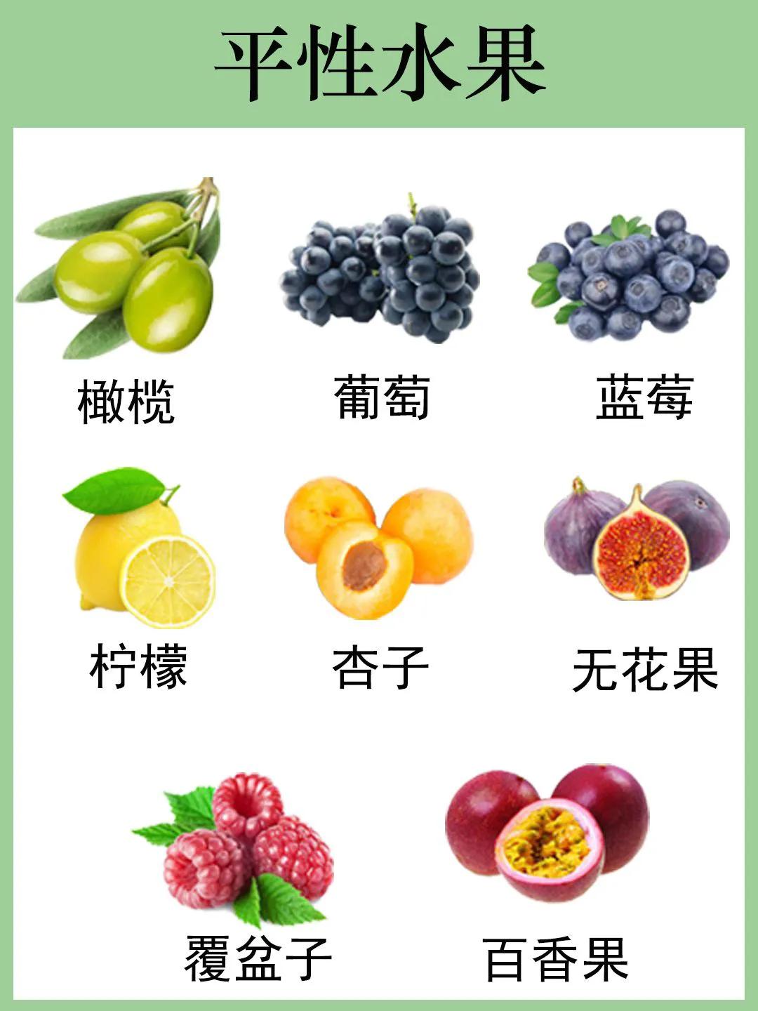 常见的平性水果有:橄榄、葡萄、杨蓝莓、柠檬、杏子、无花果、覆盆子、百香果。