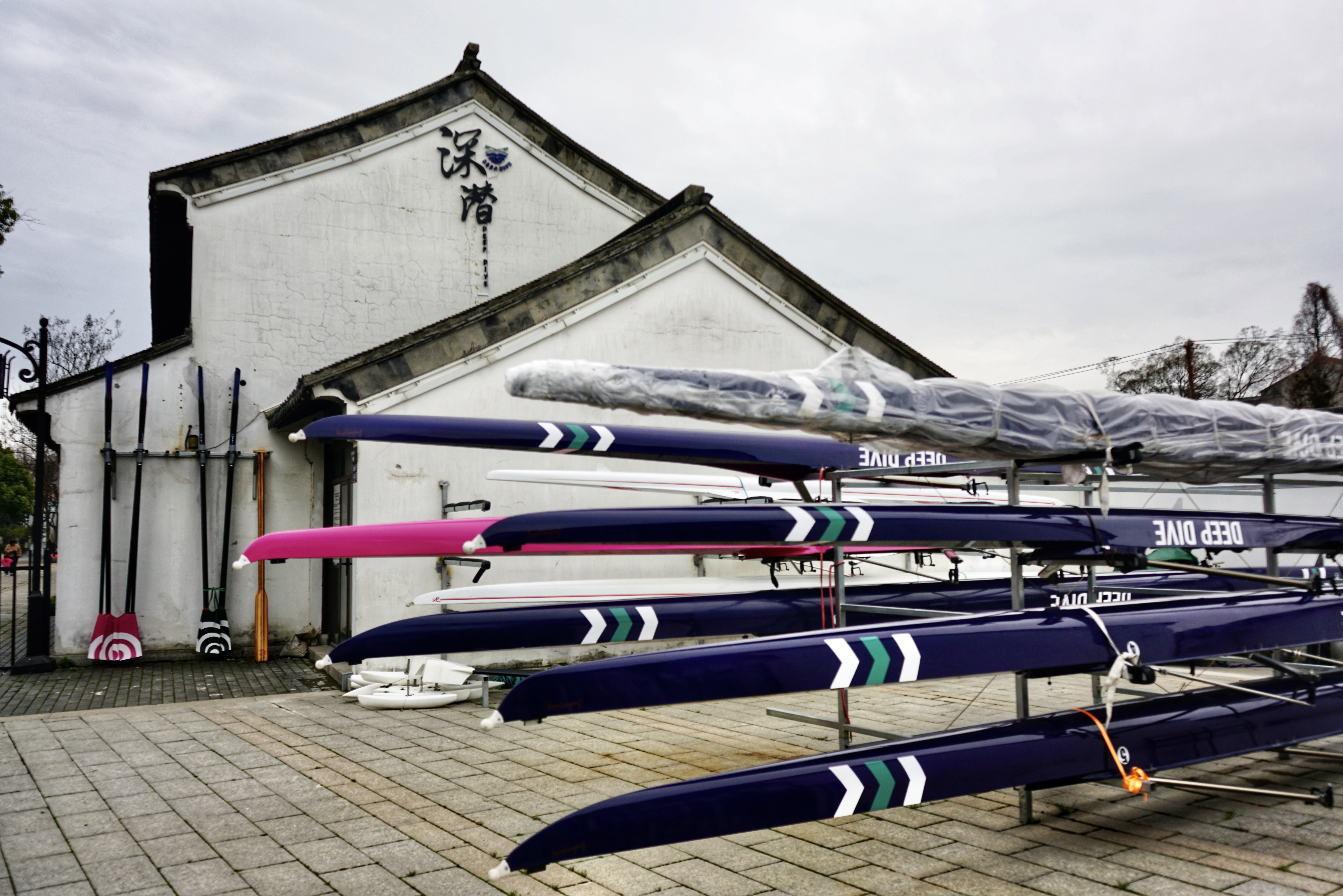 苏州深潜赛艇中心的建筑外观是粉墙黛瓦的苏式建筑风格,古朴的建筑与现代、活力的赛艇运动相结合,将古韵今风演绎得淋漓尽致。来到苏州深潜后,经验丰富的教练对我这个赛艇运动小白介绍起赛艇运动起源与兴起的故事,以及赛艇的种类规格与比赛规则。据教练介绍,赛艇是由一名或多名桨手坐在舟艇上,背向舟艇前进的方向,运用其肌肉力量,通过桨和桨架简单杠杆作用进行划水,使舟艇前进的一项水上运动。该运动起源于英国,1829年英国牛津大学和剑桥大学在泰晤士河上举行了首次校际赛艇比赛,这被视为现代赛艇运动的起源。此后,赛艇赛事日益多样化,并逐渐进入了人们的视野。