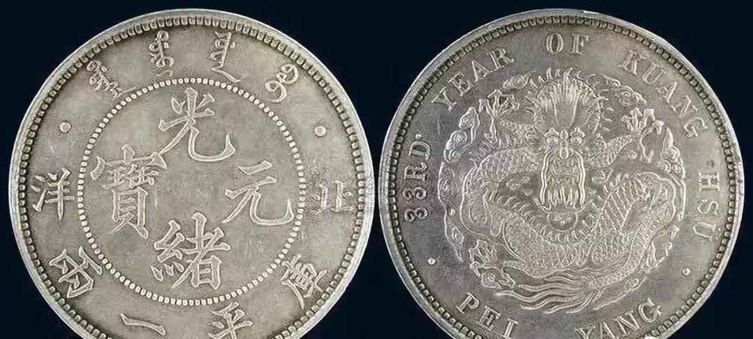 北洋原系直隶之通称,光绪三十三年(1907年)北洋造币厂奉总督之命,铸有库平一两银币,本欲推广行用,后因反对声浪高涨而失败,币面上方满文由左至右读作“光绪元宝”,背之龙图仿光绪二十九年(1903年)户部一两之图案,龙首下之龙珠上有三点(此外在另一个版本中龙珠上没有小点)。