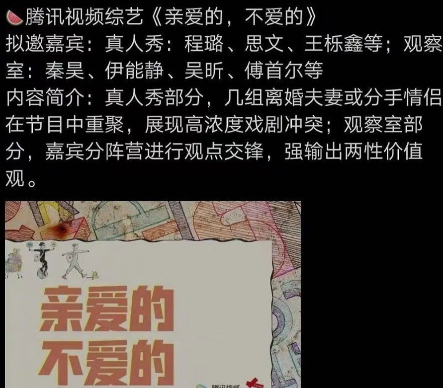 序言:近日,腾讯视频要做一个综艺节目叫《亲爱的,不爱的》,邀请几组离婚夫妻或分手情侣在节目中重聚,展现高浓度戏剧冲突,拟邀嘉宾是程璐、思文、王栎鑫等。观察室嘉宾是:秦昊、伊能静、吴昕、傅首尔等。