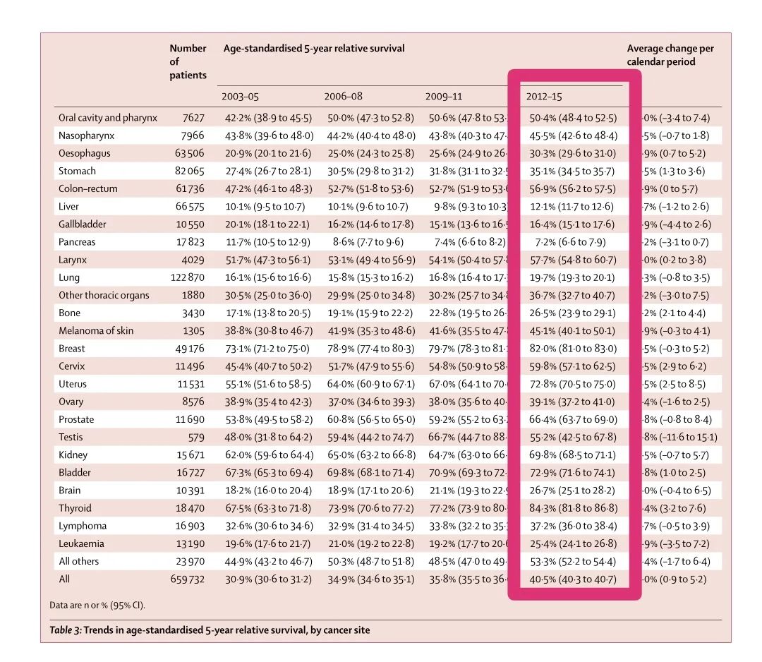 霹雳吧啦一顿计算,科学家算出了所有癌症的5年相对生存率,并把研究结果发表在《柳叶刀》上。