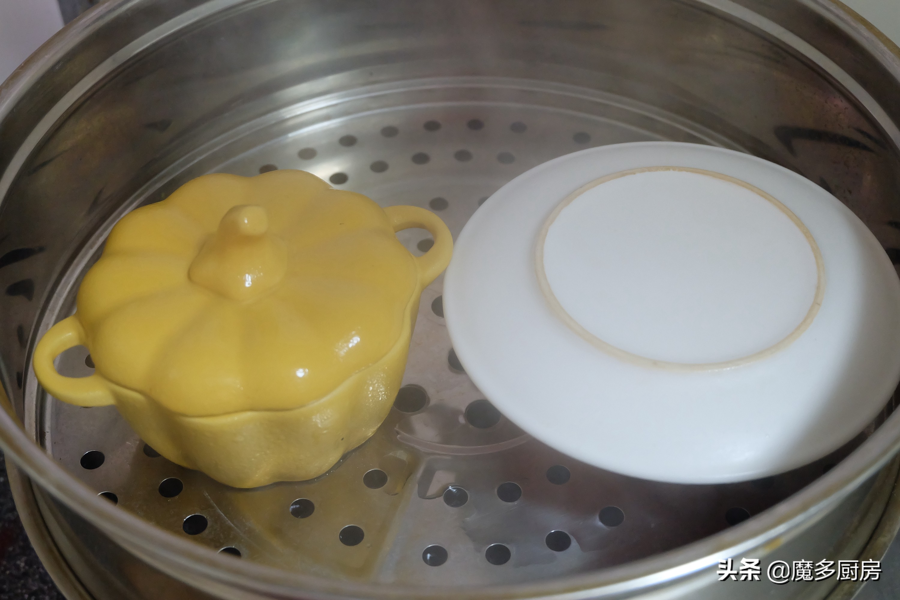步骤6:蒸锅里烧开水,把蒸碗放进锅里,分别盖上盖子。粉色小碗没有配套的盖子,倒扣一个小碟子也可以;