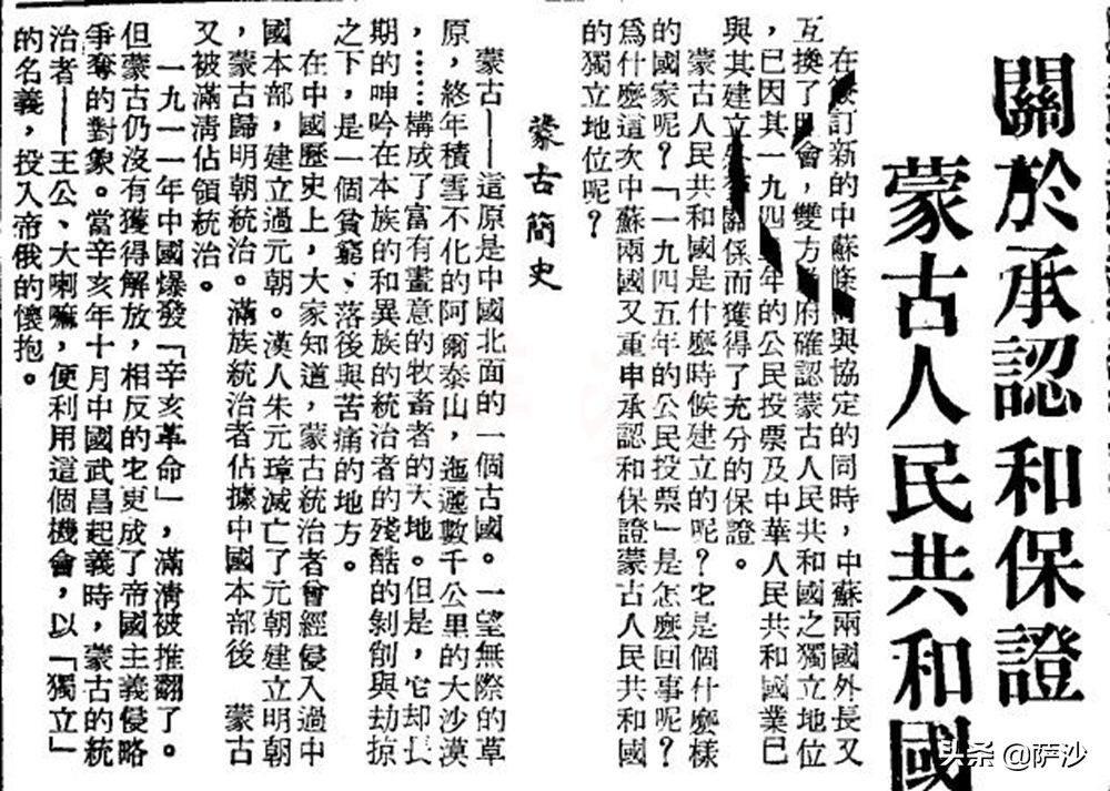 外蒙古还属于中国?1953年2月24日:台湾宣布废除《中苏友好同盟条约》并拒绝承认外蒙古独立。
