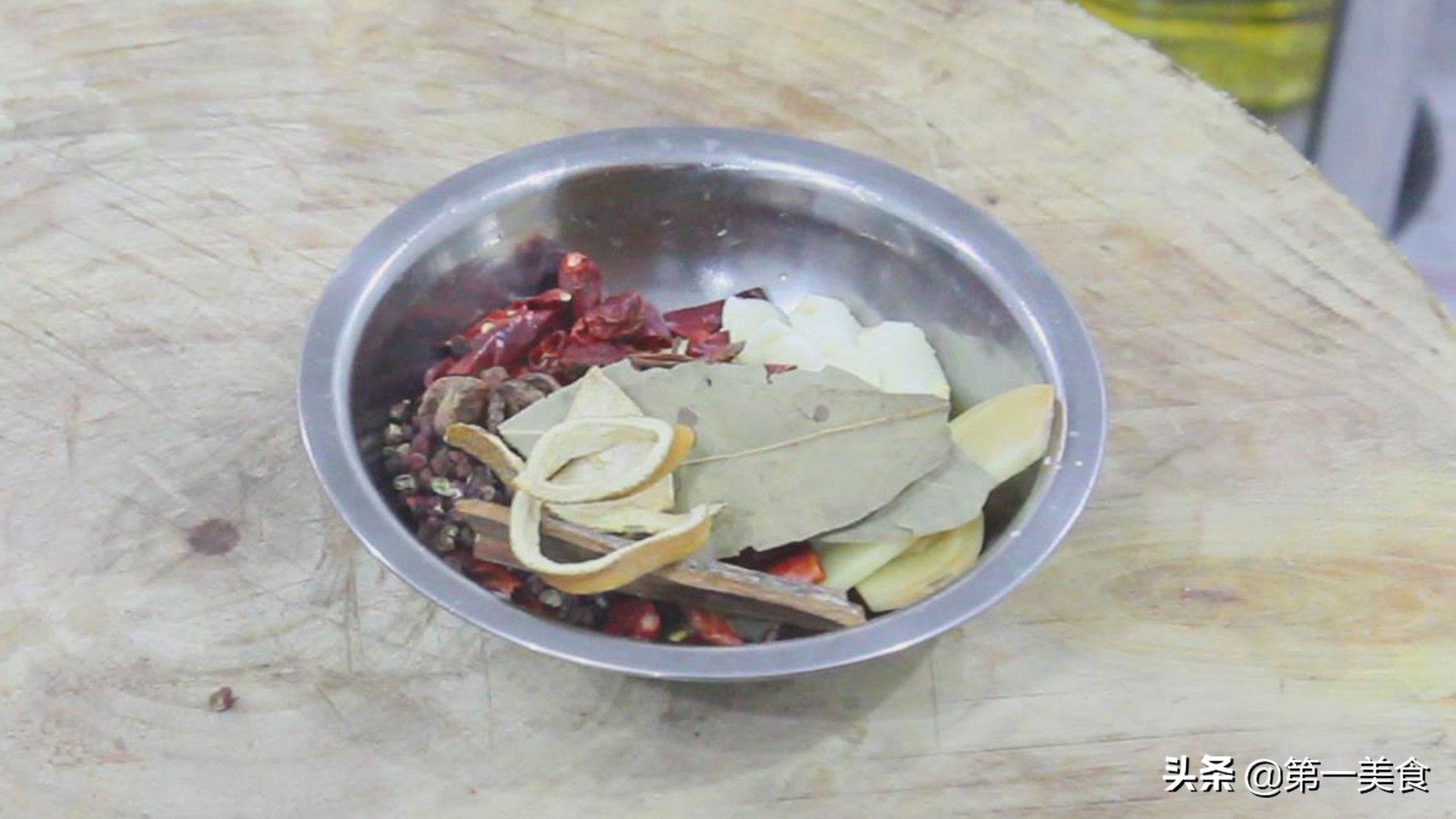 辅料:生姜、大蒜、红干椒、花椒、八角、香叶、桂皮、陈皮