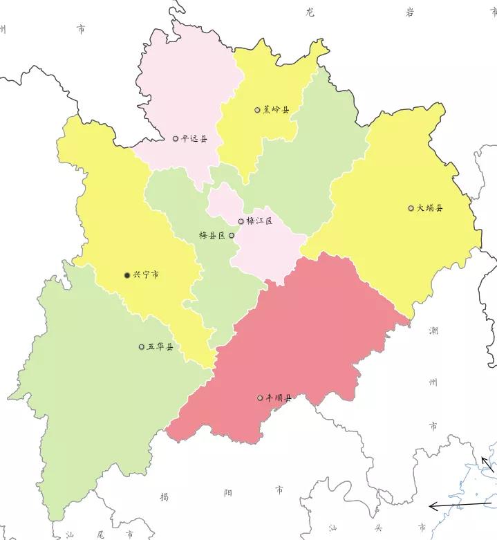 梅州市下辖2个市辖区、5个县,代管1个县级市,2019年末全市常住人口约520万人,全市面积约15925平方千米。