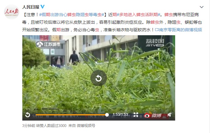 人民日报提醒:近期多地进入蜱虫活跃期。蜱虫携带布尼亚病毒,且被叮咬后难以将它从皮肤上拔出,容易引起激烈炎症反应。除蜱虫外,隐翅虫、蜈蚣等也开始频繁出没。假期出游,务必当心毒虫,准备长袖衣物与驱蚊药水!