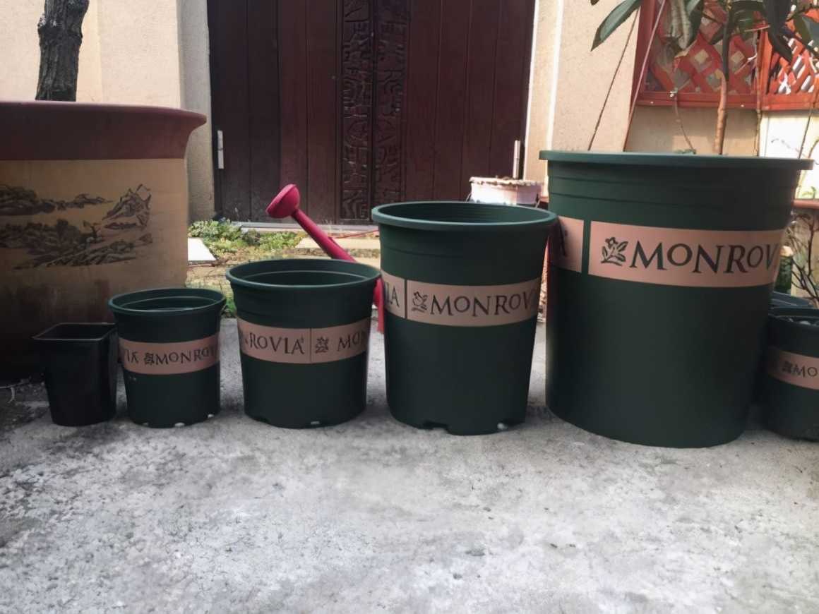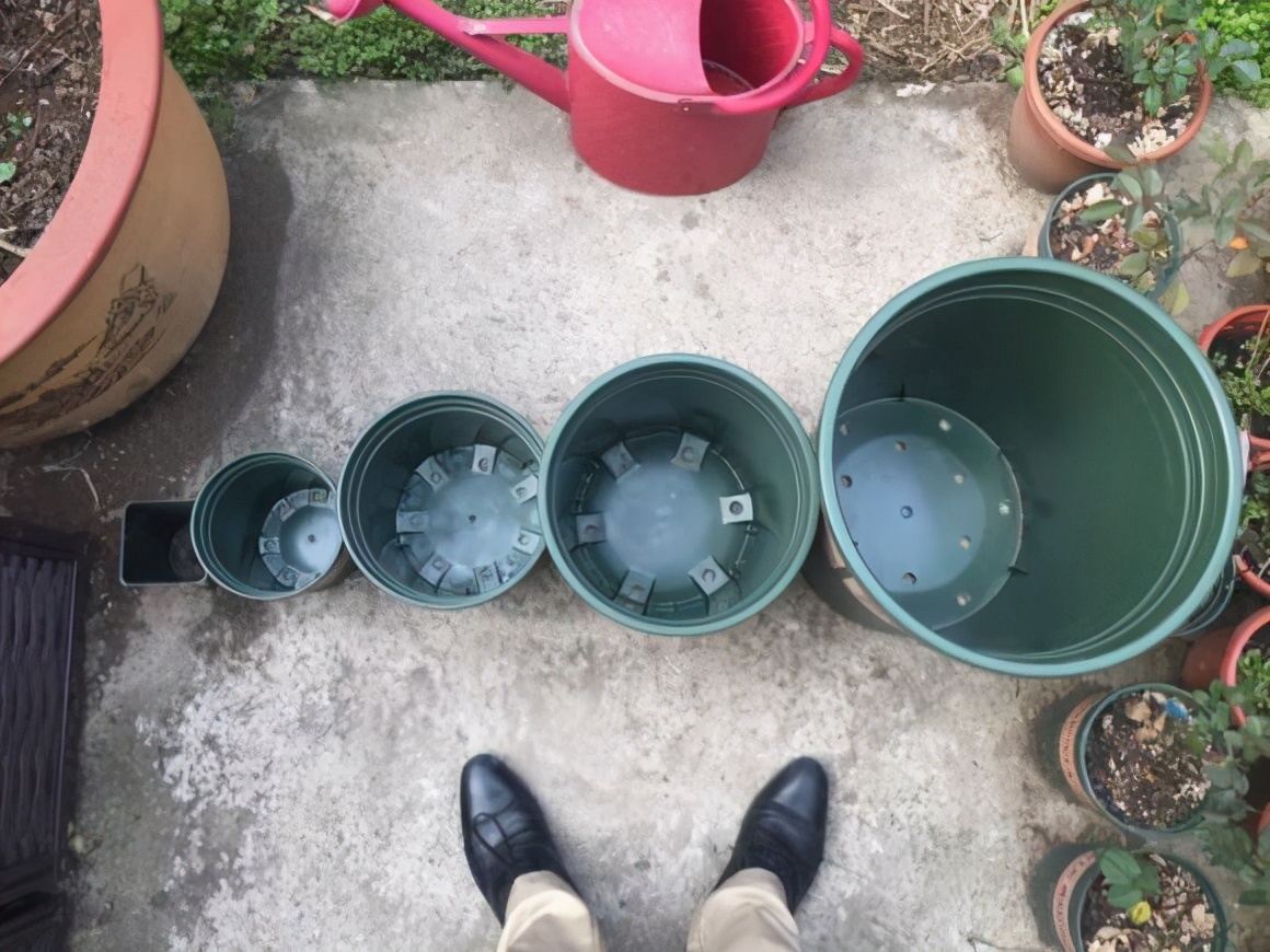 请看图,先来张几个盆的合影,方便对比。从左至右是:买花带的v9方盆、1加仑、2加仑、5加仑、7加仑。