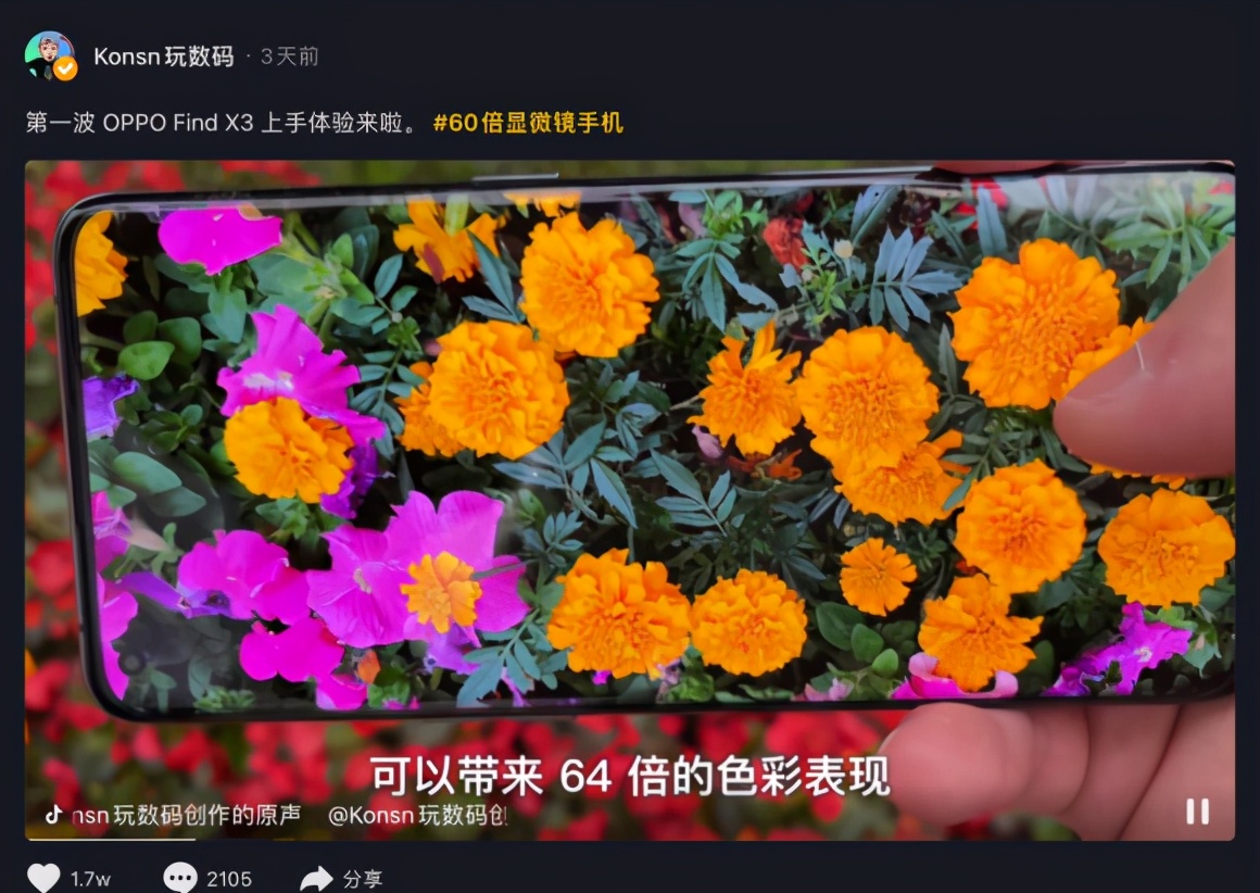 恰巧,最近我在抖音刷到了新机OPPO Find X3的测评,有博主在说这款手机在后期处理视频和上传平台时不会影响画质。