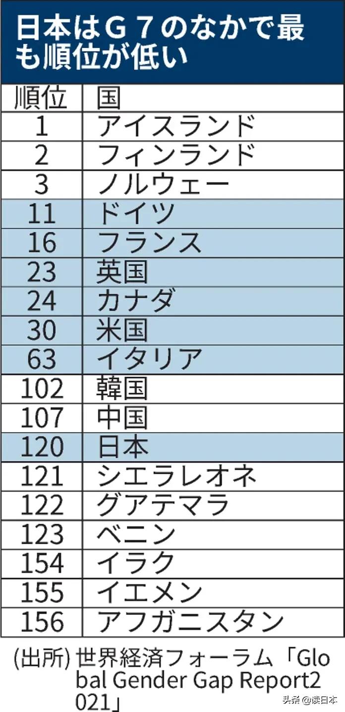 报告共统计了156个国家,其中日本排名第120位,不仅在G7七国集团中垫底,还落后于同处亚洲的中韩两国(韩国排名102位,中国排名107位)。