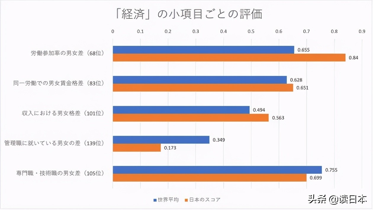 经济上来说,日本男女平等度排名靠后,主要有三方面原因:一是男女收入差距较大,排名第101位;二是企业的女性管理者较少,排名第139位;三是专业技术方面女性从业人数较少,排名第105位。