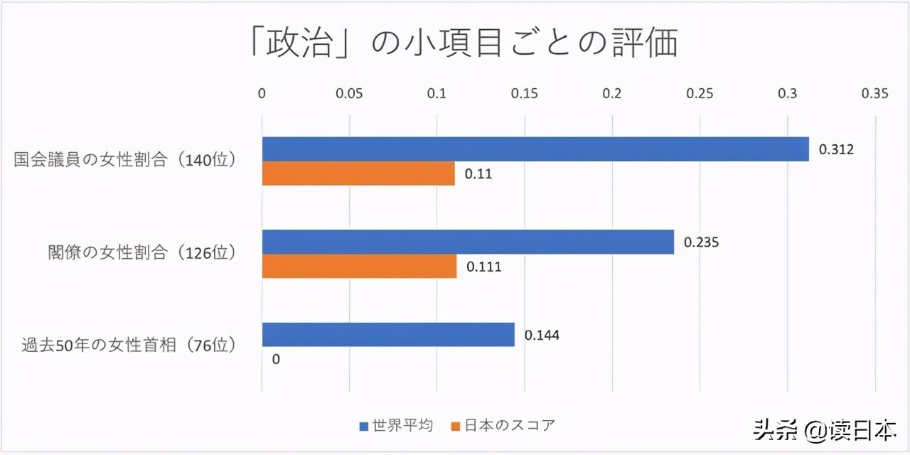 据调查显示,日本国会议员中女性占比评分0.11,排名第140位,内阁成员中女性占比评分0.111,排名第126位。再加上日本至今没有过女首相,使得日本女性的参政比例远远低于世界平均水平。