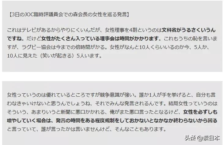 他在奥委会董事会议上这样说:“女性理事占4成的话,一定会很吵吧。有很多女性参加的理事会,会花费更多的时间。女人的竞争意识太强,如果有一个人发言,另一个也一定会说,结果就是大家都要发言。如果女性理事非要增加的话,就要限制发言时间,否则会议很难结束。”