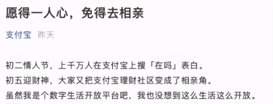 “不想相亲”四个字,意味深长。细品之下,可以看出这位基民并不愿意自己被“剩下”,也不愿意被迫到相亲市场上“卖个好价钱”,更不愿意接受“父母之命、媒妁之言”、和一个自己不爱的对象了此一生。