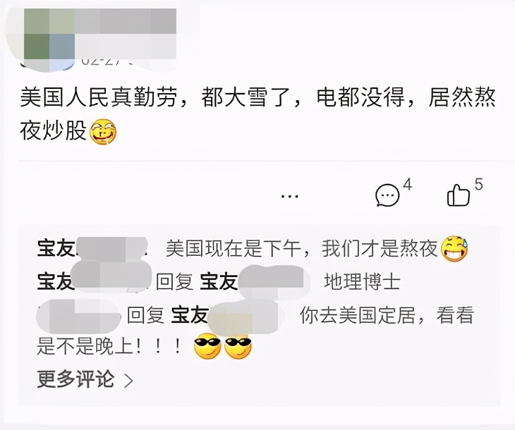 实际上,美国和中国之间有大概半天的时差,咱们晚上的时候美国是白天,美国人民怎么会熬夜炒股呢?熬夜玩美股基金的是我们才对啊!“小丑竟是我自己”……这位网友当然明白这个道理,只不过他是玩地理梗来自黑而已。
