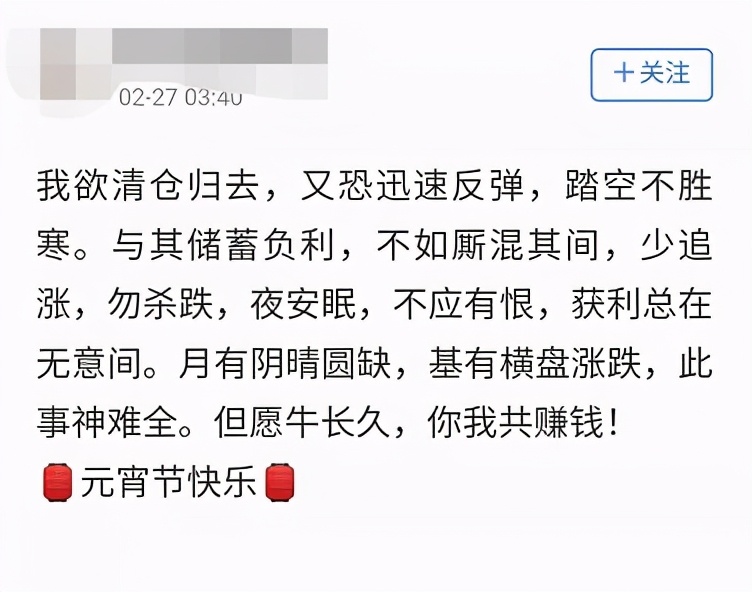 还有这首《水调歌头》,写出了基民患得患失的矛盾心态,结尾“但愿牛长久,你我共赚钱”,愿望虽好,多半落空。作者明着没点出这个意思,暗中却蕴含着这种豁达,足以见得笔力深厚,如果不是在“基”海混个遍体鳞伤,实难悟到如此见地。