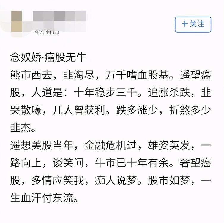 基金讨论区在今年爆火之前,就有很多“梗”广为流传。有的人喜欢作诗,比如这首《念奴娇 · 癌股无牛》,语调悲怆,让被套牢基民的形象跃然纸上。不过我还是建议,这首诗可以改名为《念奴娇 · 赤壁怀股》,巧用谐音,说不定这诗就出圈了。