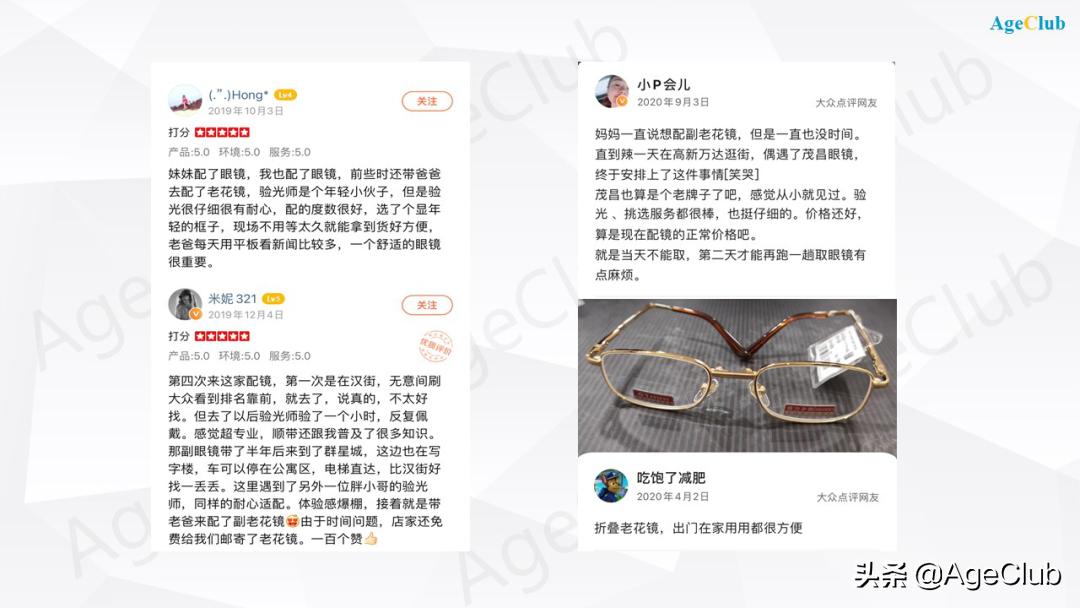 这一点,从美团、大众点评里不少眼镜店里的用户评论可见一斑。在大众点评,搜索老花镜,能看到不少去线下验光配镜的老人,或者子女带着老人去配镜的现象。