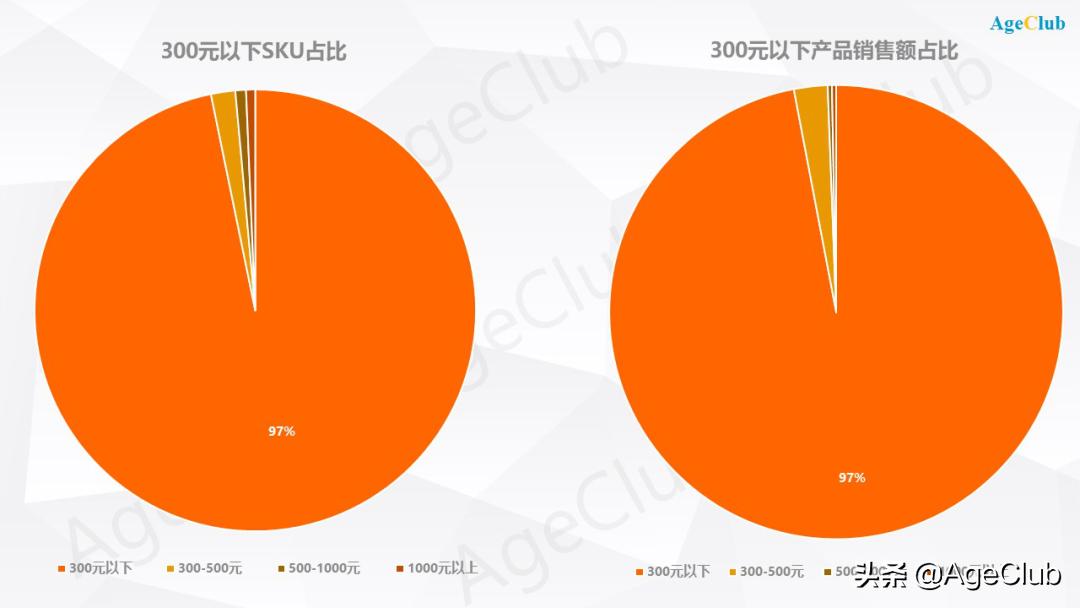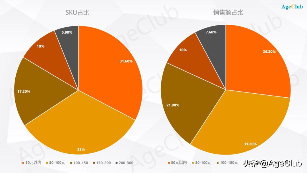 - 再具体看下图中300元以内不同价格带的产品数量和销售额占比,80%的产品价格在150元以内。