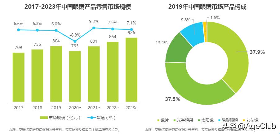 根据艾瑞咨询发布的《2020年中国眼镜镜片行业白皮书》(以下简称白皮书),2019年,中国眼镜产品零售市场规模为804亿元,这其中,老花镜占比仅1.6%,在所有眼镜品类中占比最低,甚至远远低于隐形眼镜的占比。