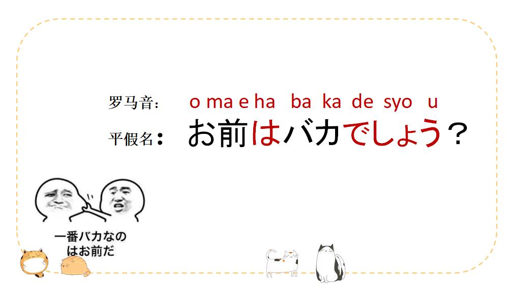 お前はバカでしょう?你怕是个傻子吧。お前(o ma e)是你的意思。バカ(ba ka)这个单词我们最熟悉了,就是我们经常说的八嘎牙路里面的八嘎,~は~でしょう?是日语里面最常使用的疑问句,意思就是:是~~~吗?比如你是个美女吧,日语的表达方式就是:お前は美人(bi ji nn)でしょう?或者如果问你是不是个有钱人也可以用到这个句型:お前はお金持ち(o ka ne mo ti)でしょう?陌生的单词都有在后面打上了罗马音哦,同学可以自己跟着读一下。