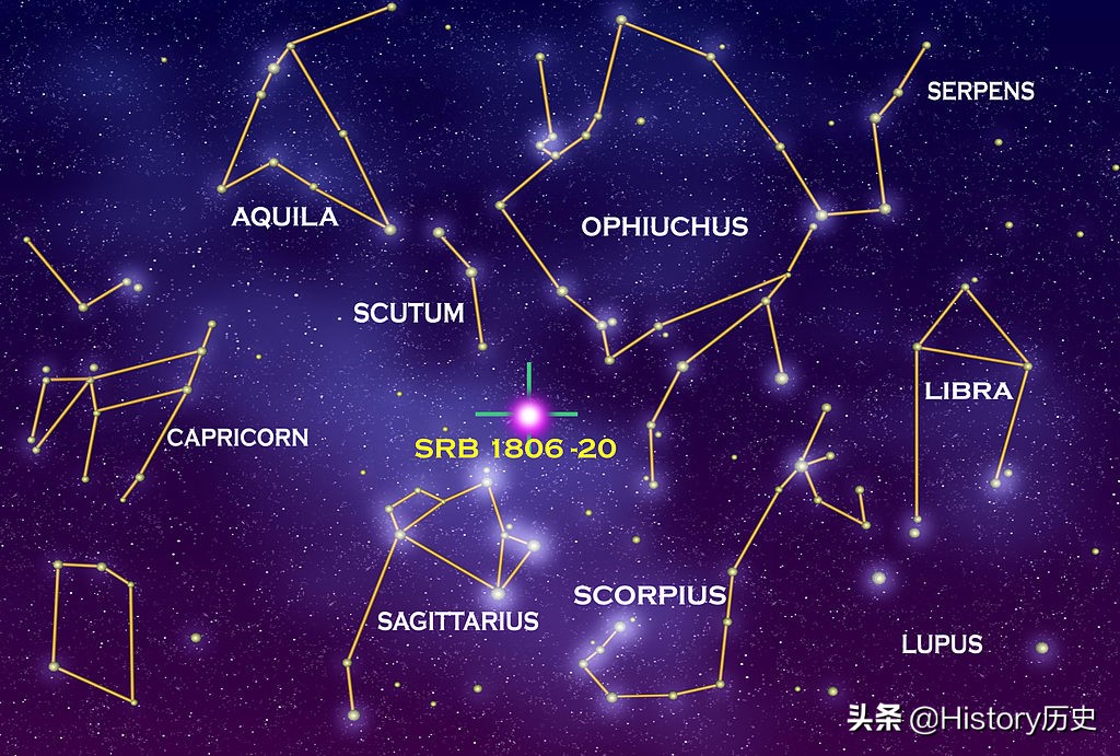 换句话说,要制造一颗1.255个非洲面积大小的核弹,其威力才能与5万年前SGR1806-20中子星发生的地震的威力相当。还有,它爆发发出的大量X射线和伽马射线十分强烈,以致在到达月球时发生弹射,改变了路线。