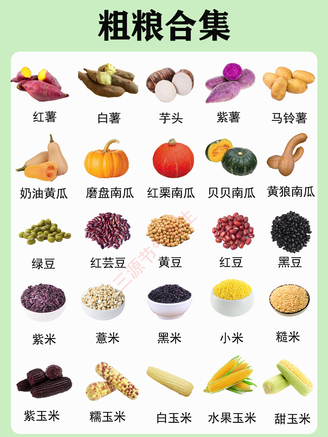 今天给大家总结了25种粗粮,有红薯、白薯、芋头、紫薯、马铃薯、奶油南瓜、磨盘南瓜、红栗南瓜、贝贝南瓜、黄狼南瓜、绿豆、红芸豆、黄豆、红豆、黑豆、紫米、薏米、黑米、小米、糙米、紫玉米、糯玉米、白玉米、水果玉米、甜玉米等,这些粗粮做起来不仅好吃,而且热量相对较低。
