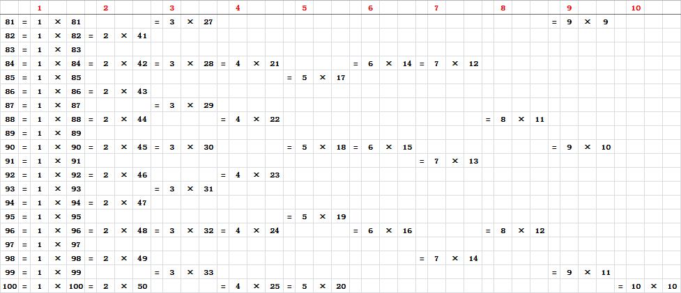 第四步——这张新表做出来后,可以再和孩子回顾一下前面学习的“平方”、“倍数”和“因数”,在新表中找到那些数字。