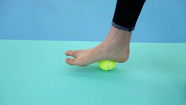 在家找一个网球,没有话可以找一个软的圆形的东西替代,如上图所示,把球放在脚底来回滚动,训练10分钟左右。