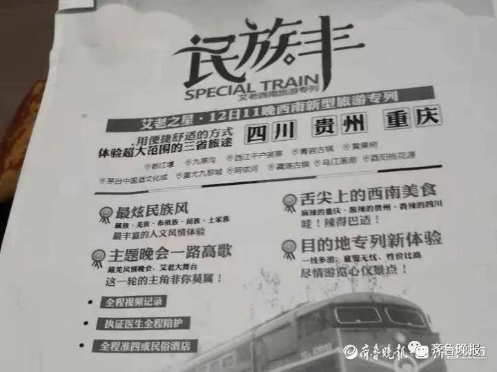 陈女士告诉记者,2019年12月时,山东神州国旅举办了一场酒会,邀请了包括她在内的很多老客户。在酒会上,神州国旅发布了一个名为艾老西南旅游专列的新项目,行程包含四川、贵州、重庆三省市,2020年3月出发, 12天11晚只需3400元。看到很多人报名,她也报了名。
