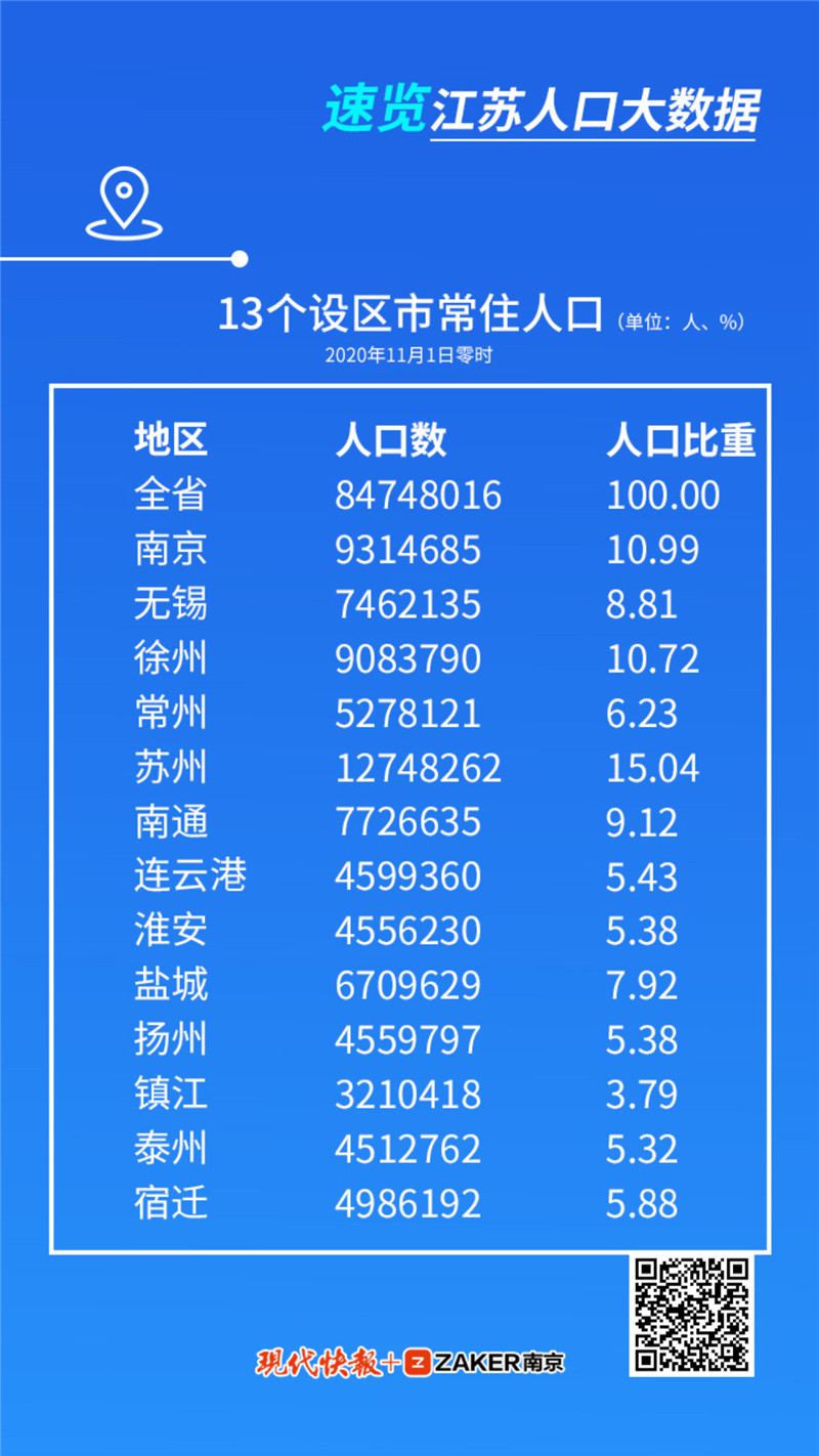 全省人口分布发生了很多新变化。江苏省第七次全国人口普查领导小组办公室副主任、省统计局人口和就业处副处长马永春表示,首先是人口区域性集中度明显。他介绍,南京、无锡、常州、苏州四市的常住人口占全省比重,从2010年江苏省第六次全国人口普查的37.41%上升到41.04%,其余各市人口所占比重都有不同程度的下降。