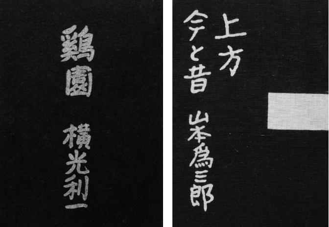 横光利一的《鸡园》(1942年)与山本为三郎的《上方今与昔》(1958 年),均为佐野繁次郎装帧设计。