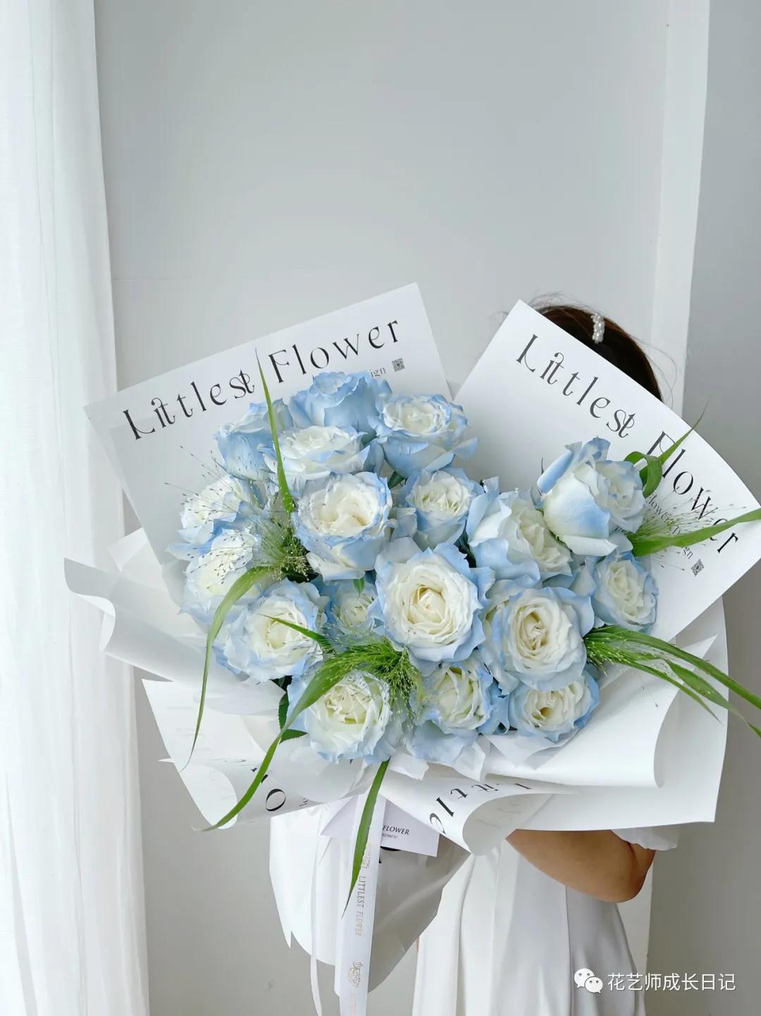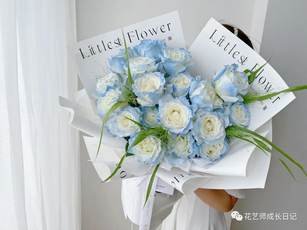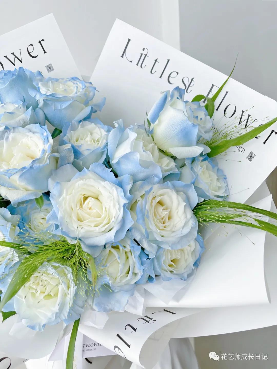 本期花艺奇思妙想关键词:520告白,从一束碎冰蓝玫瑰花束开始。