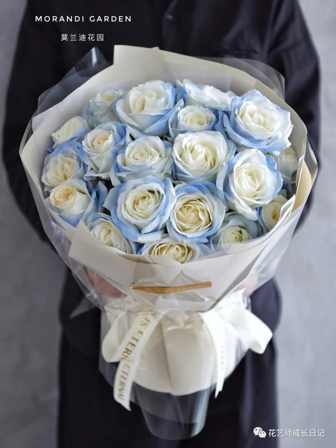 碎冰蓝玫瑰花束一般选用的都是白玫瑰,这一款所用到的就是骄傲玫瑰。只有纯净的白,才能衬托出蓝色的优雅。
