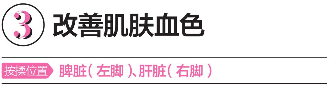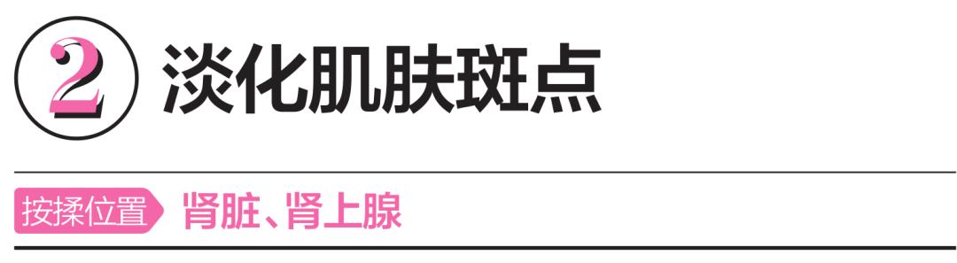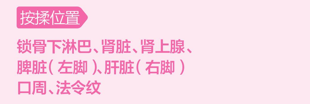 消除锁骨下淋巴的阻塞之后,刺激4个器官。改善肾脏功能就可以使肌肤斑点消失,肾上腺就会分泌美容所必不可少的激素。提升脾脏和肝脏的血液循环,改善脸色。最后刺激口周和法令线,消除皱纹和松弛现象!