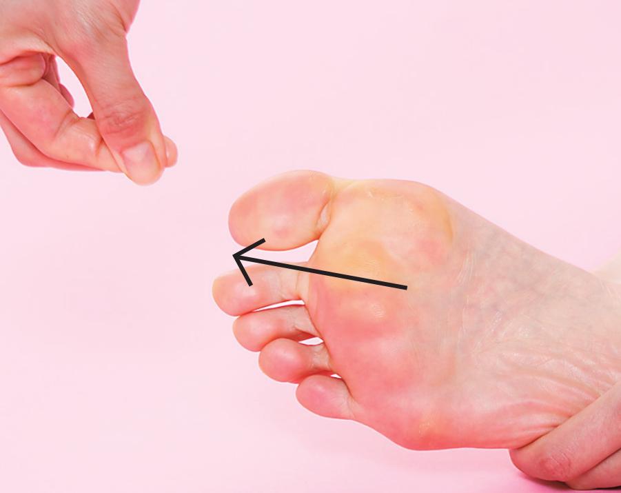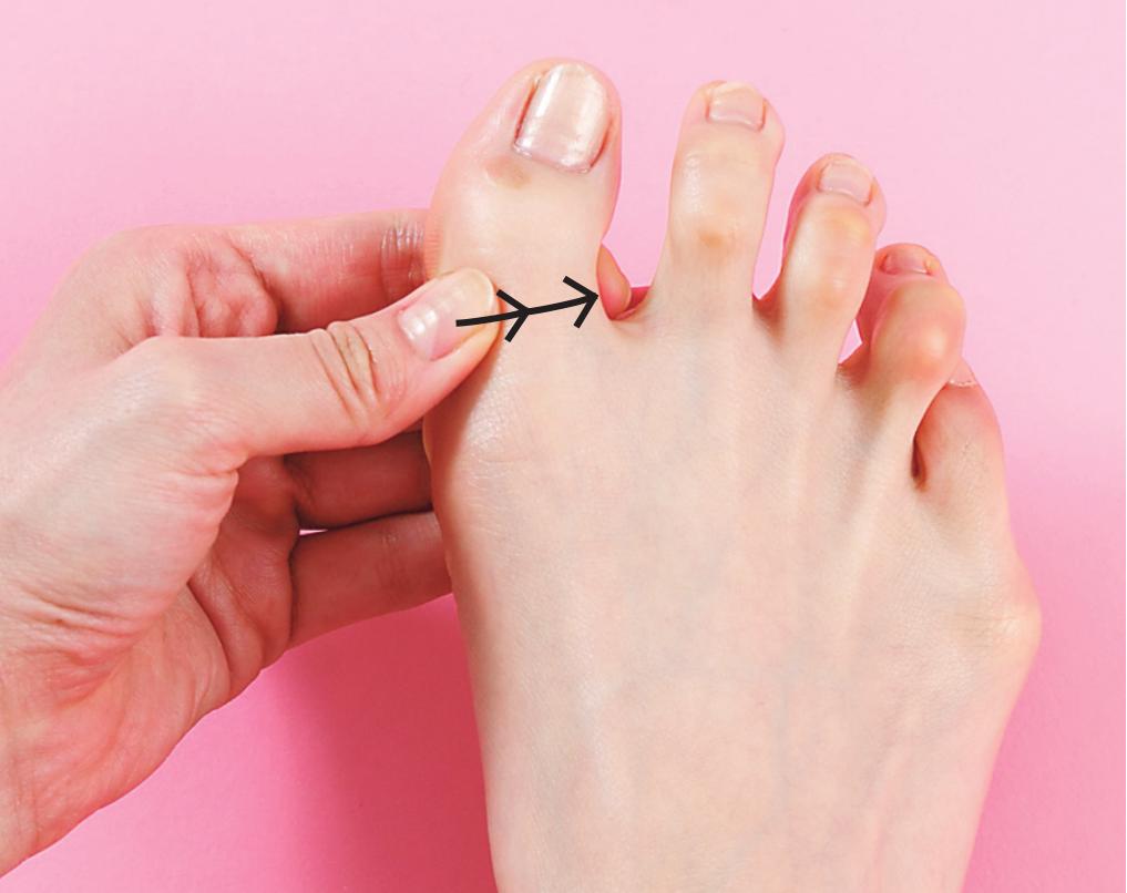 按压锁骨下淋巴反射区能够改善颈部以上的淋巴循环。将各个脚趾从根部开始用手大拇指和食指进行深度按压,抓住脚趾根部以下2-3cm处。