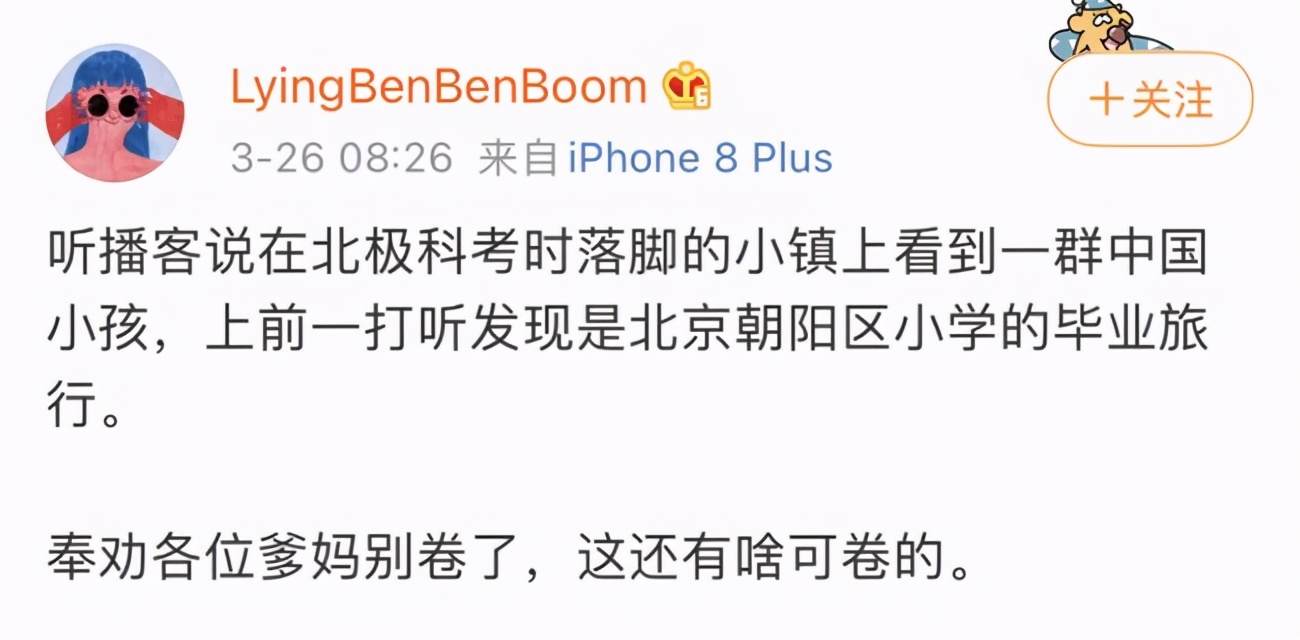 还有最近,有一位小学生晒出了到北极游学的视频,这个孩子用自己的假期到了北极考察,然后写了长长的一段感悟和心得。可是,大家看到的是孩子表面上的见多识广,谁又知道这一趟旅行下来父母得花二十多万,一般家庭就不说舍不舍得,还真不见得有几个家庭能一次拿得出来的。
