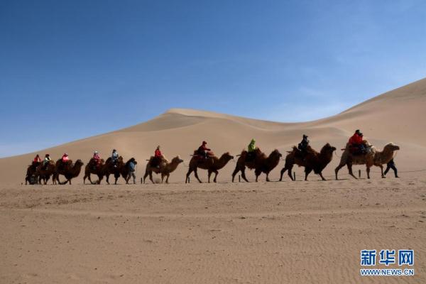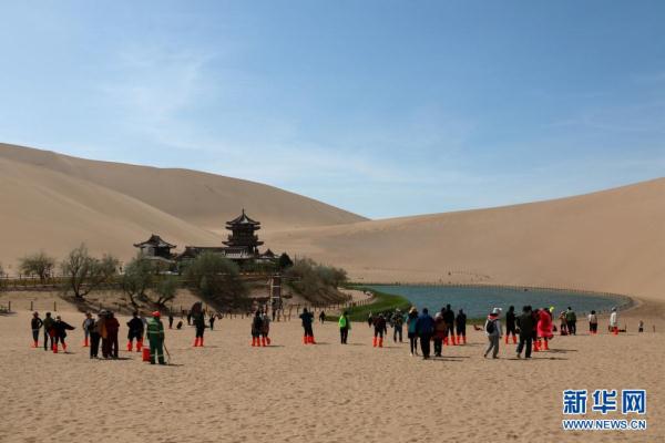 4月25日,游客在甘肃省敦煌市鸣沙山月牙泉景区游览。