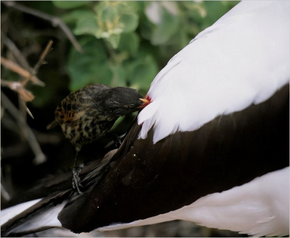 加拉帕戈斯群岛的14种雀类对达尔文的进化论非常重要。难怪它们被称为“达尔文雀”。但最近的研究发现,其中一些其实是“吸血鸟”。雀鸟通常以种子为食,在旱季,它们往往放弃干旱地区,选择环境条件较好的地区。但这种地雀的一个亚种常年生活在两个干燥的岛屿上,靠血液补充种子。这些被称为“吸血鸟”的地上鸟类有一种独特的偷取海鸟血液的策略:它们只啄较大鸟类背部的伤口,这只够让伤口张开,血液流出,而不让宿主反击或飞走。