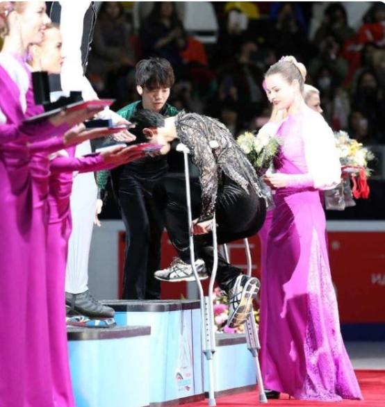 2018年世界花滑大奖赛俄罗斯站,羽生带着右脚踝伤势参赛,并最终夺冠,颁奖仪式上,他拄着双拐、使劲撑起身体跳上颁奖台的一幕也令所有人泪目。
