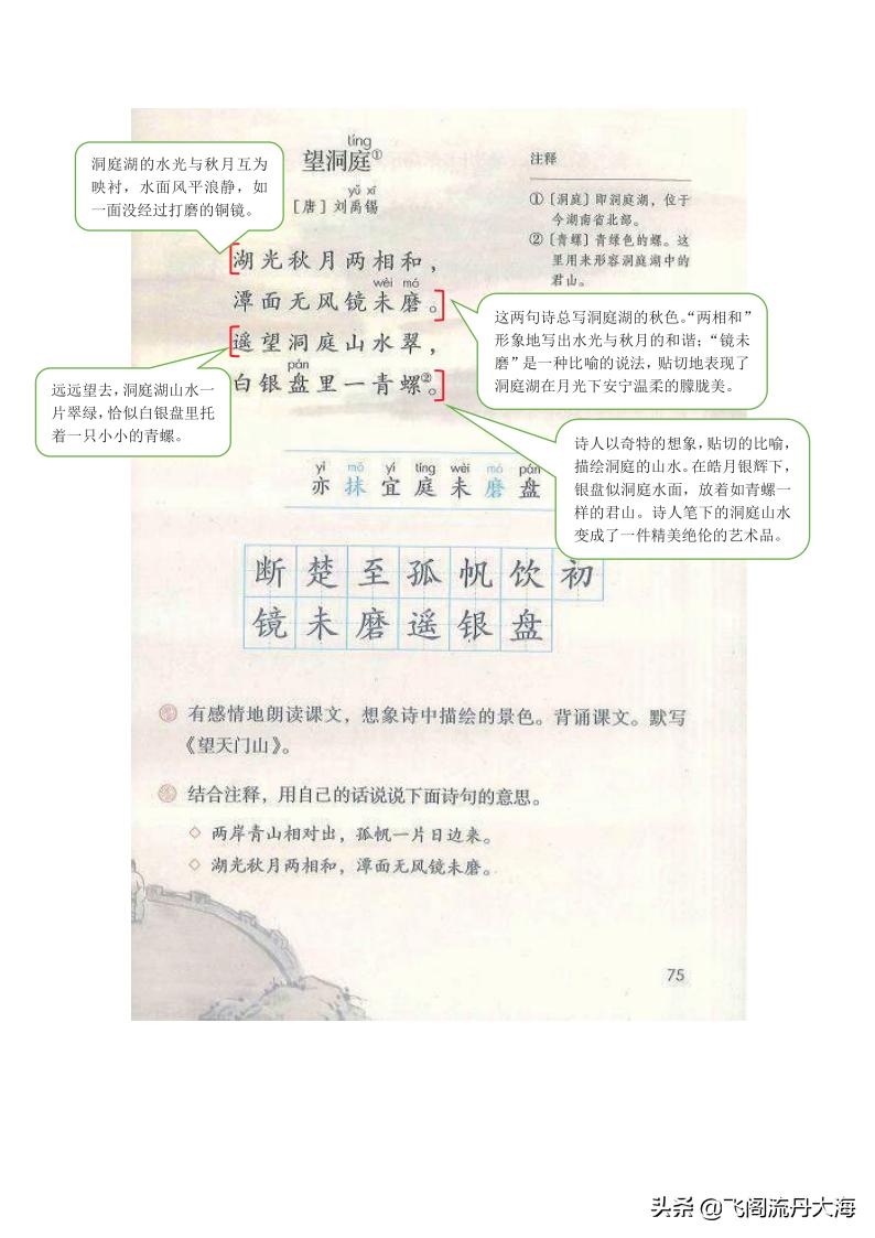 4.用自己的话说说诗句的意思:远远望去洞庭湖山水一片翠绿,恰似白银盘子托着青青的田螺。