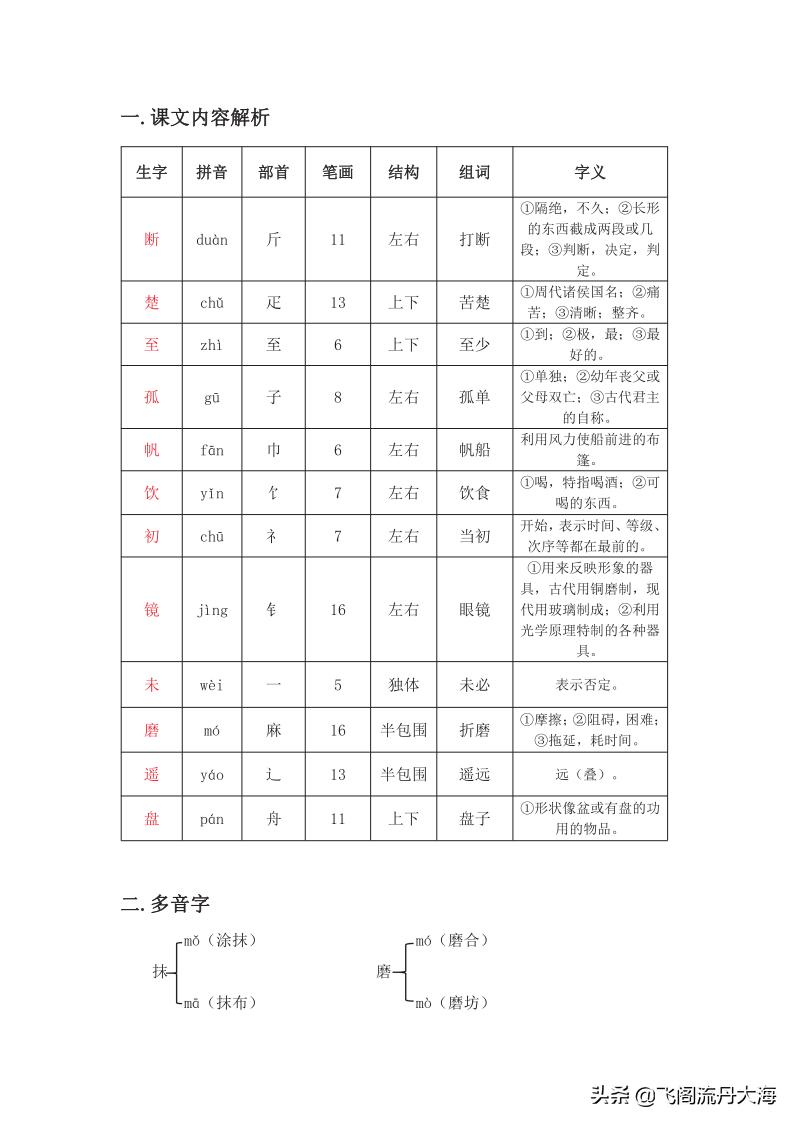 1.认识“亦、宜”等7个生字,正确书写“断、楚”等13个生字,认识多音字“抹、磨”。正确读写诗句中的词语。