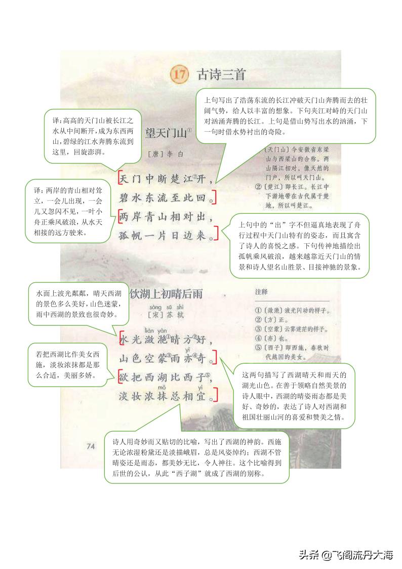3.引导想象:楚江即长江,古代长江中游地带属楚国,所以叫楚江。流经古代楚国的这一段叫楚江,终点在天门山,天门山以东是吴国,流经吴国的长江段,叫吴江。天门山高、俊秀、险,诗人写到天门山犹如被江水冲击而隔断似的。
