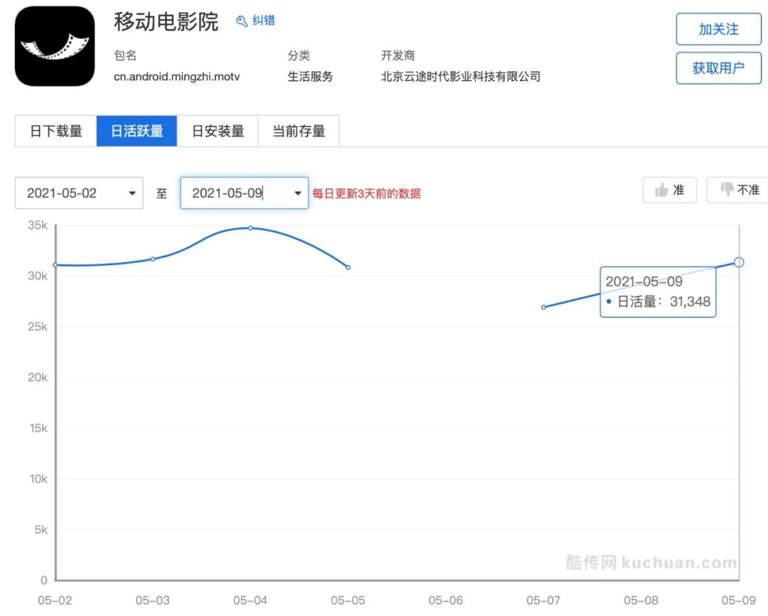 犀牛君查阅APP监控网站“酷传”发现,移动电影院安卓版近7天的日活量在3万上下波动,即便9日开了发布会,日活量也并未获得太大涨幅;而日下载量在7日、8日飙升到8万多后,也迅速下滑,后回归到日下载5千左右的水准。