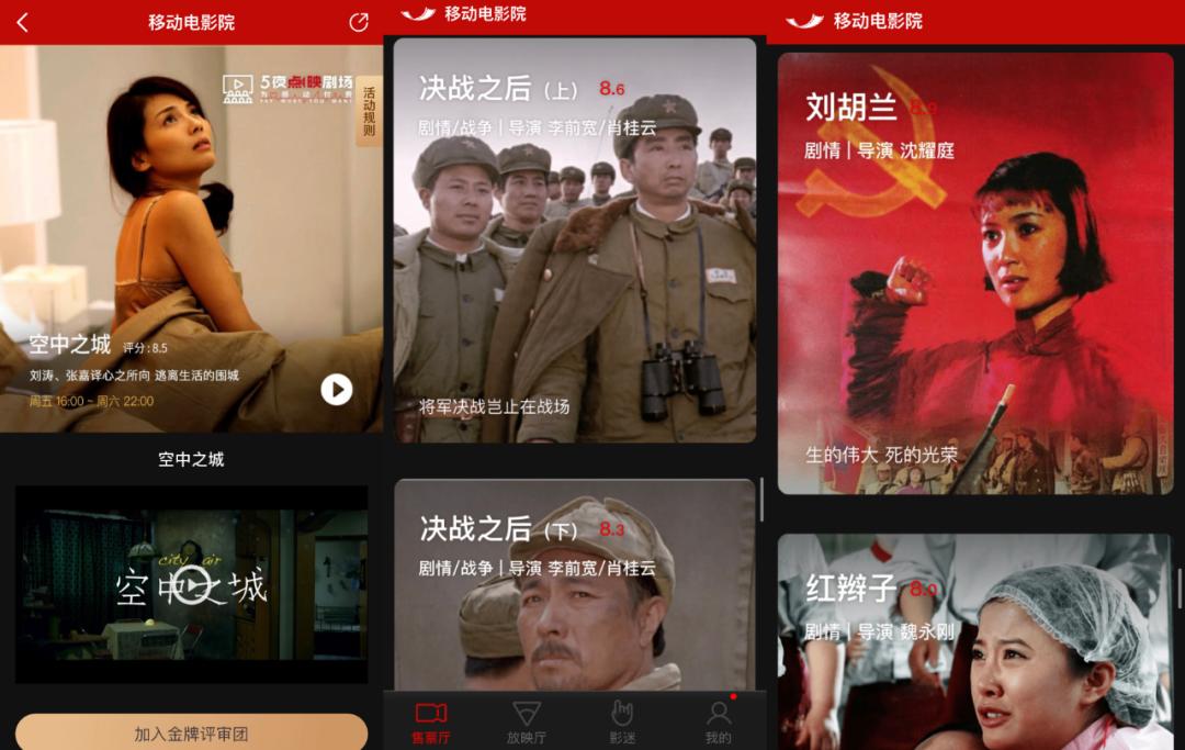 打开最新的4.0.2版APP,移动电影院可供用户观看的影片分为两类,一类是建党100周年主旋律影片,如《决战之后》《刘胡兰》等,数量上占了平台的七成比例,剩下三成多为电影节系的小众文艺片,如刚上线的、由梅峰老师编剧的新片《空中之城》。