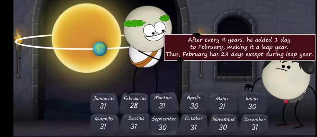 因为每年仍然多出0.24天,每四年,他在二月份增加了一天。使之成为闰年。因此除了闰年,二月份有28天。