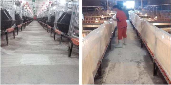 1、先在猪舍地面喷洒适量的水,把生石灰均匀地撒在猪圈每个角落,与水反应生成氢氧化钙,可以对多种细菌和病毒有杀灭作用,对口蹄疫、猪瘟病毒以及环境中多种细菌都有很好的灭杀效果;同时对环境中的寄生虫也有很好的灭杀作用。
