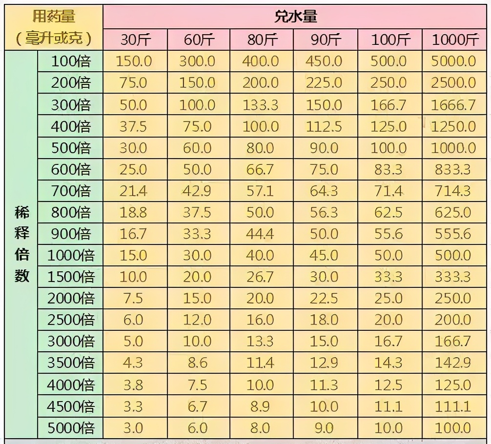 经常有网友问我们怎么配药,怎么算兑水量和用药量,不知其他人是不是也有类似的疑问?前些天小编发现个超级易懂的配药表,稍加整理,现分享给大家,以下就是常用的配药(初略)换算列出,兑水量和稀释倍数对应用药量。