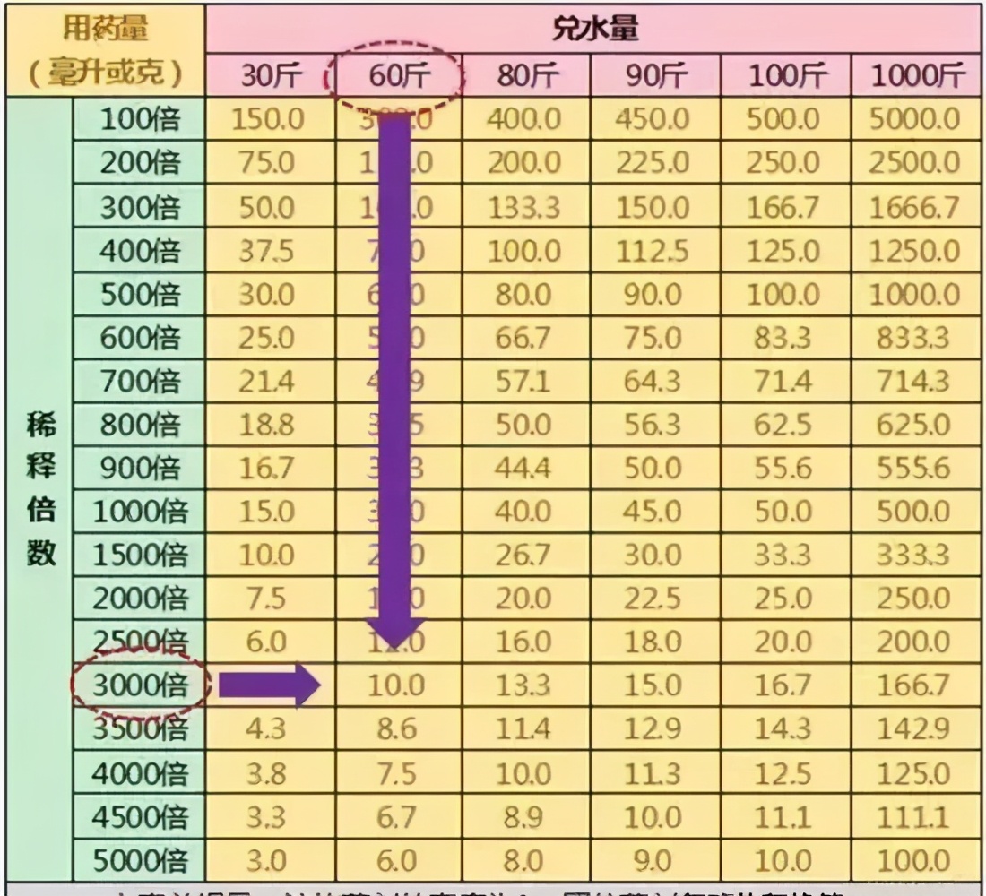 举个例子,药剂的稀释倍数是3000倍,要配60斤水,所需要的药剂量就是10毫升或10克。同理,30斤水加了6毫升的药剂,它的稀释倍数是2500倍。