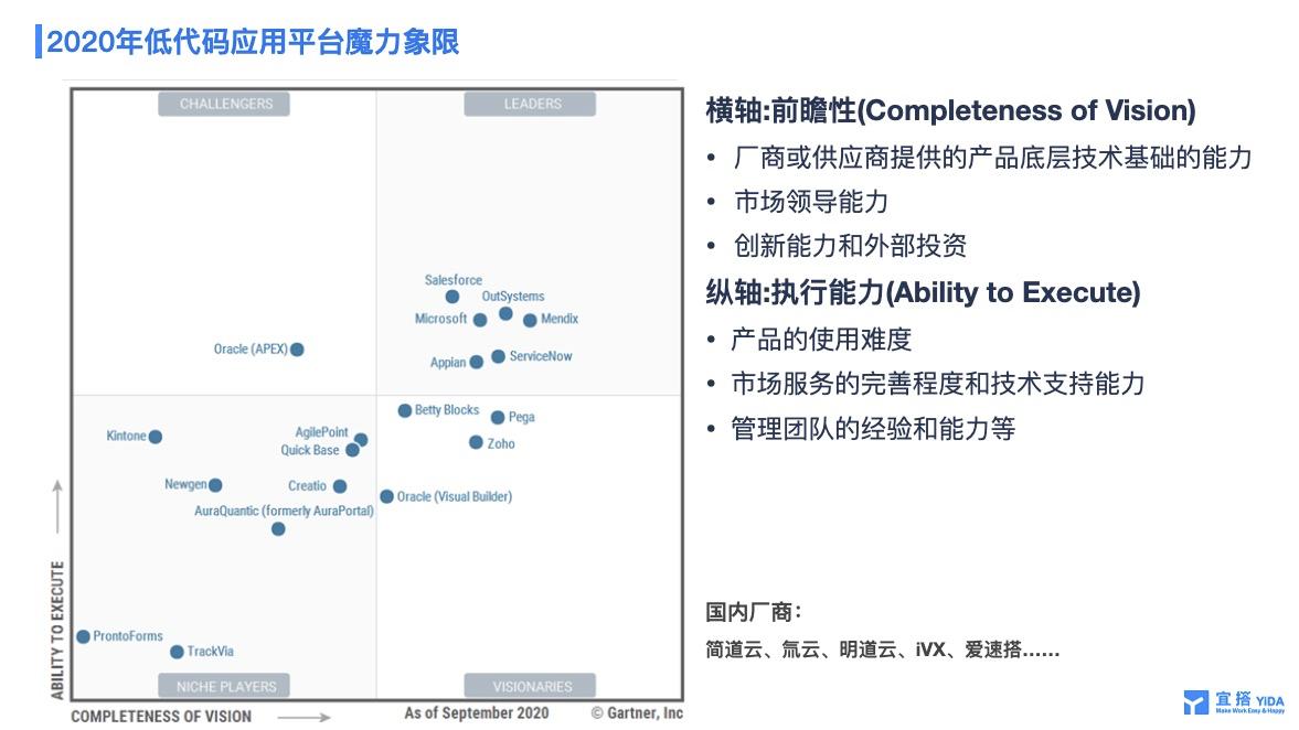 1、领导者:行业领导者既要表现出超强的执行能力(好的产品与良好的销售业绩相匹配),又要表现出具有远见(产品创新和相称的营销策略)的战略计划。LCAP 的领导者主要包括云 SaaS 提供商(Microsoft、Salesforce、ServiceNow),专业的低代码提供商(Mendix、OutSystems)以及混合 RPA 和低代码应用程序供应商(Appian)。这些供应商具有强大产品能力、市场影响力以及用户体验。